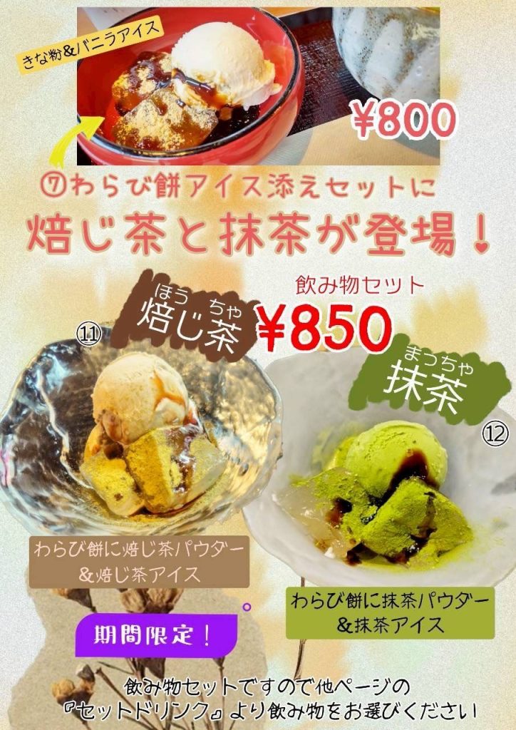 わらび餅アイス添えセットに焙じ茶味と抹茶味が期間限定で登場しました!お好みの飲み物と一緒にお楽しみください。